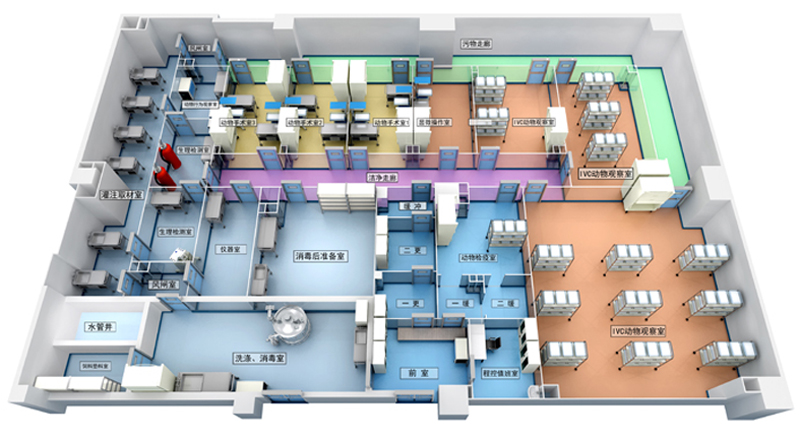 動物實驗室一般由飼養室、健康觀察室、隔離檢疫室、各種實驗室(外科手術、實驗處理解剖、術后管理、疾病診斷、治療、生理生化檢查、微生物檢疫、飼料營養分析和特殊飼料的調制室等),以及貯藏室、清潔準備室、洗滌消毒室、工作人員用房(包括辦公室、淋浴室、更衣室等)、走廊(清潔區和污染區)、廢棄物處理設施、機房和變電所等組成。